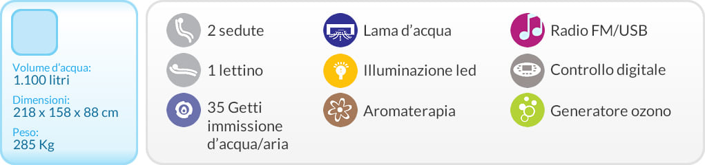 Il massaggio rilassante è garantito da ben 39 getti di immisione acqua, aria e combinati.