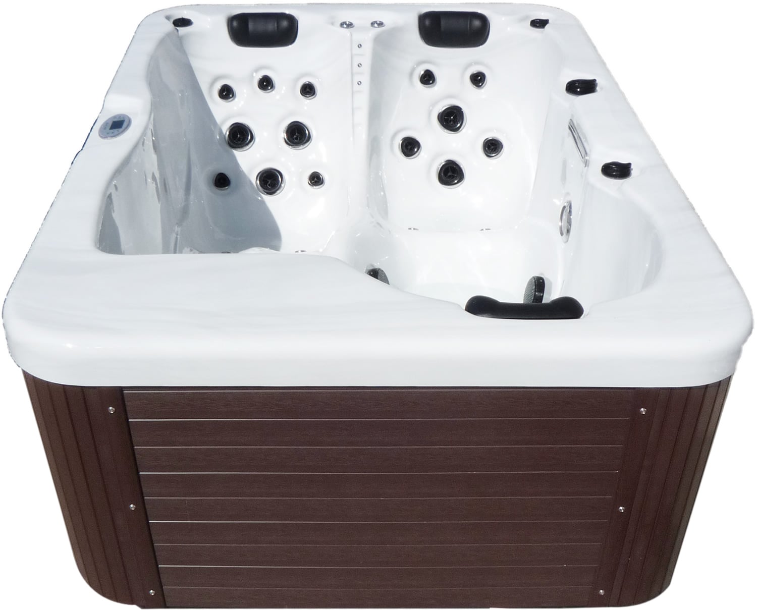 Vasca idromassaggio da esterno per 3 persone. Completa di pannello di controllo digitale, riscaldatore, ozonizzatore e radio FM con lettore USB. Ingombro esterno 2,18x1,58 m. Altezza: 0,88 m. Color caffè.