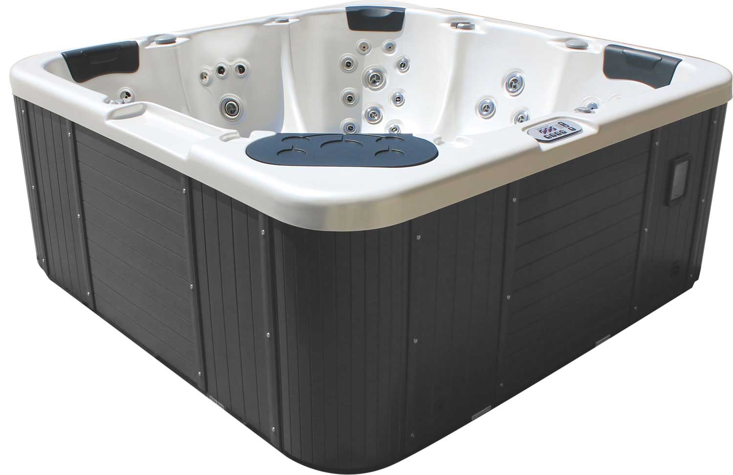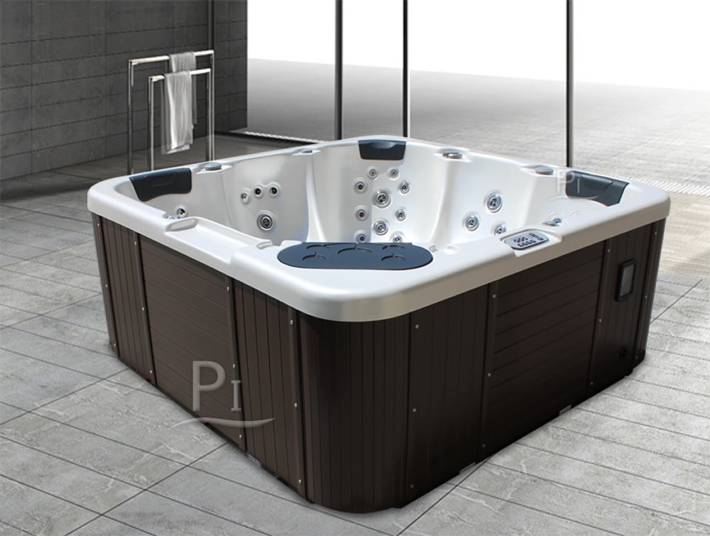 Vasca idromassaggio minipiscina da esterno per 5 persone. Completa di pannello di controllo digitale, riscaldatore, ozonizzatore e radio FM. Ingombro esterno 2,18x2,18 m. Altezza: 0,88 m. Color grigio.