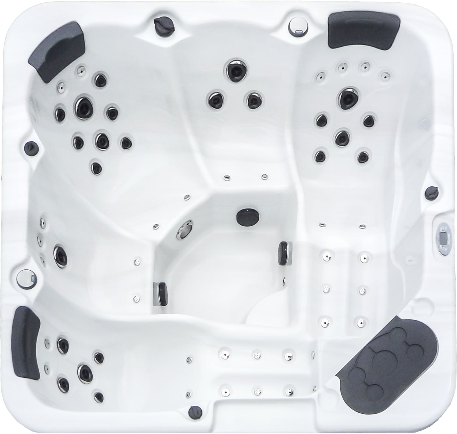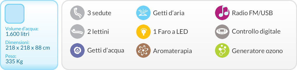 Il massaggio rilassante è garantito da 63 getti di immisione acqua e aria, di cui 19 bocchette rotative con getto combinato acqua/aria che generano un gradevole effetto stimolante sui tessuti muscolari, con rilevanti benefici alla circolazione sanguigna e linfatica.