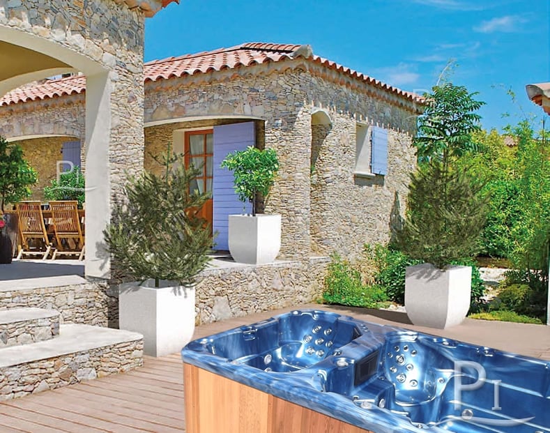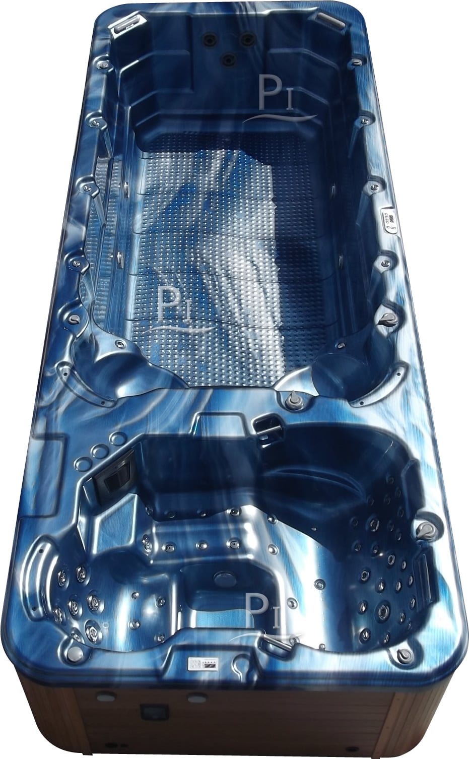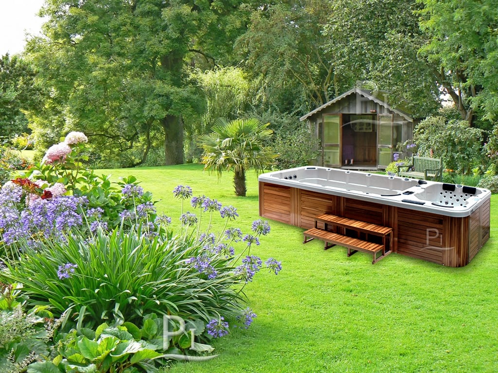 Minipiscina idromassaggio da giardino con sistema per nuoto controcorrente, per 5 persone. Dimensioni 5,80x2,20 m. Altezza: 1,20 m.